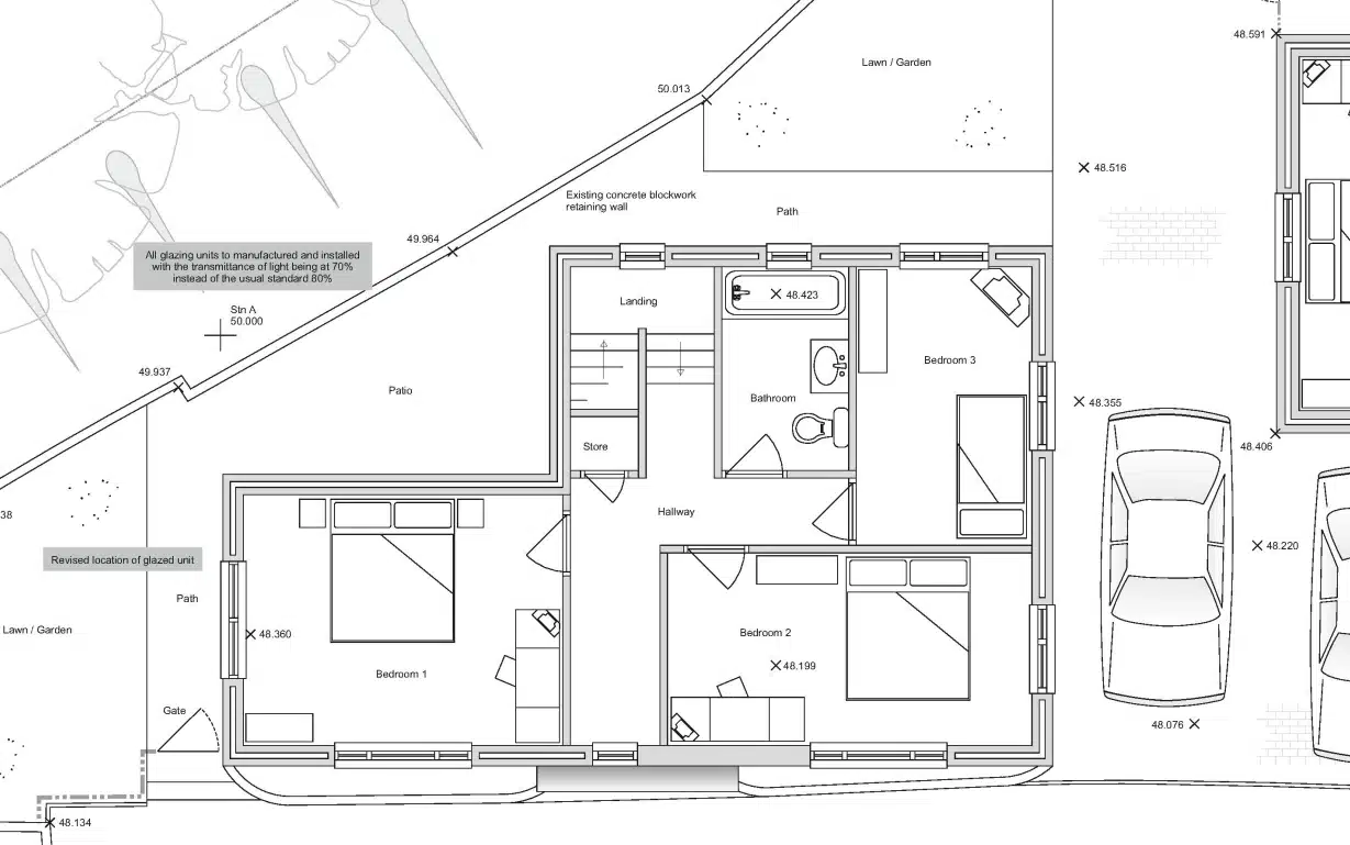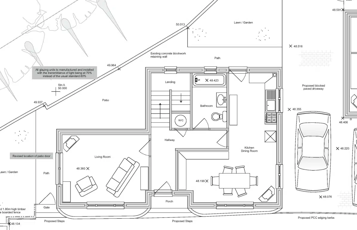 On the ground floor, the accommodation is shown to comprise of an entrance hallway, W.C., living room, open plan kitchen/dining room and a bathroom. Stairs lead to the first floor where three bedrooms are proposed along with a further bathroom.