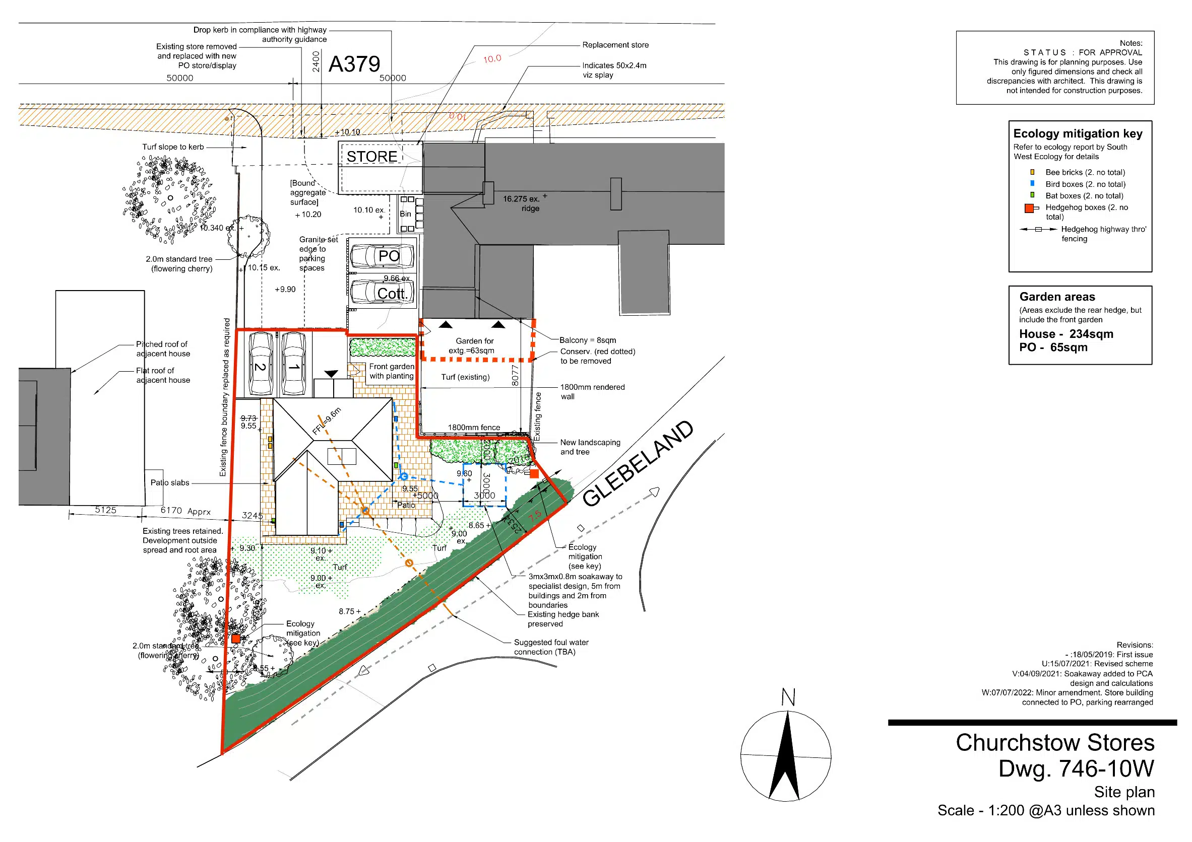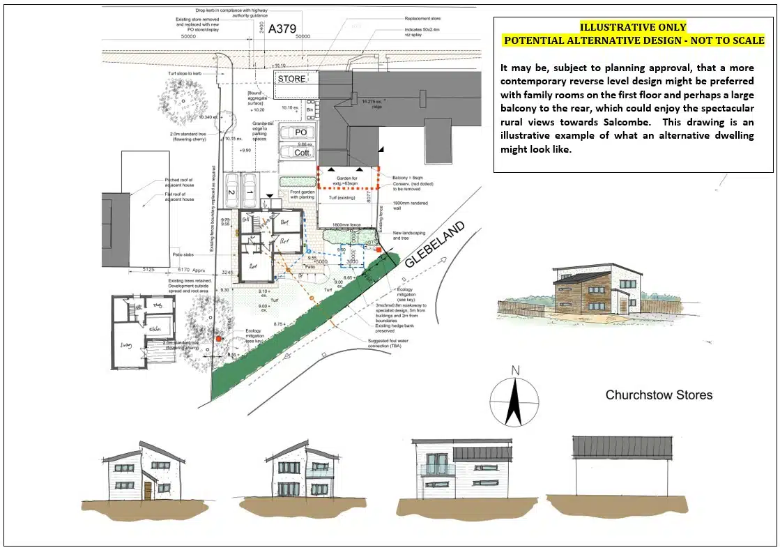 The plot is one element of planning permission 2955/21/FUL that comprises the reconfiguration of Churchstow Post Office and shop including private off road car parking. An application to vary condition 2 of the aforementioned planning permission which relates only to the layout of the parking, store and bin storage, was approved by South Hams District Council (SHDC) 11 November 2022. The plot is generally level and extends to approximately 0.04 ha/0.10 acres as approximately identified by a red outline on the site plan below, submitted under the variation application 3157/22/VAR.