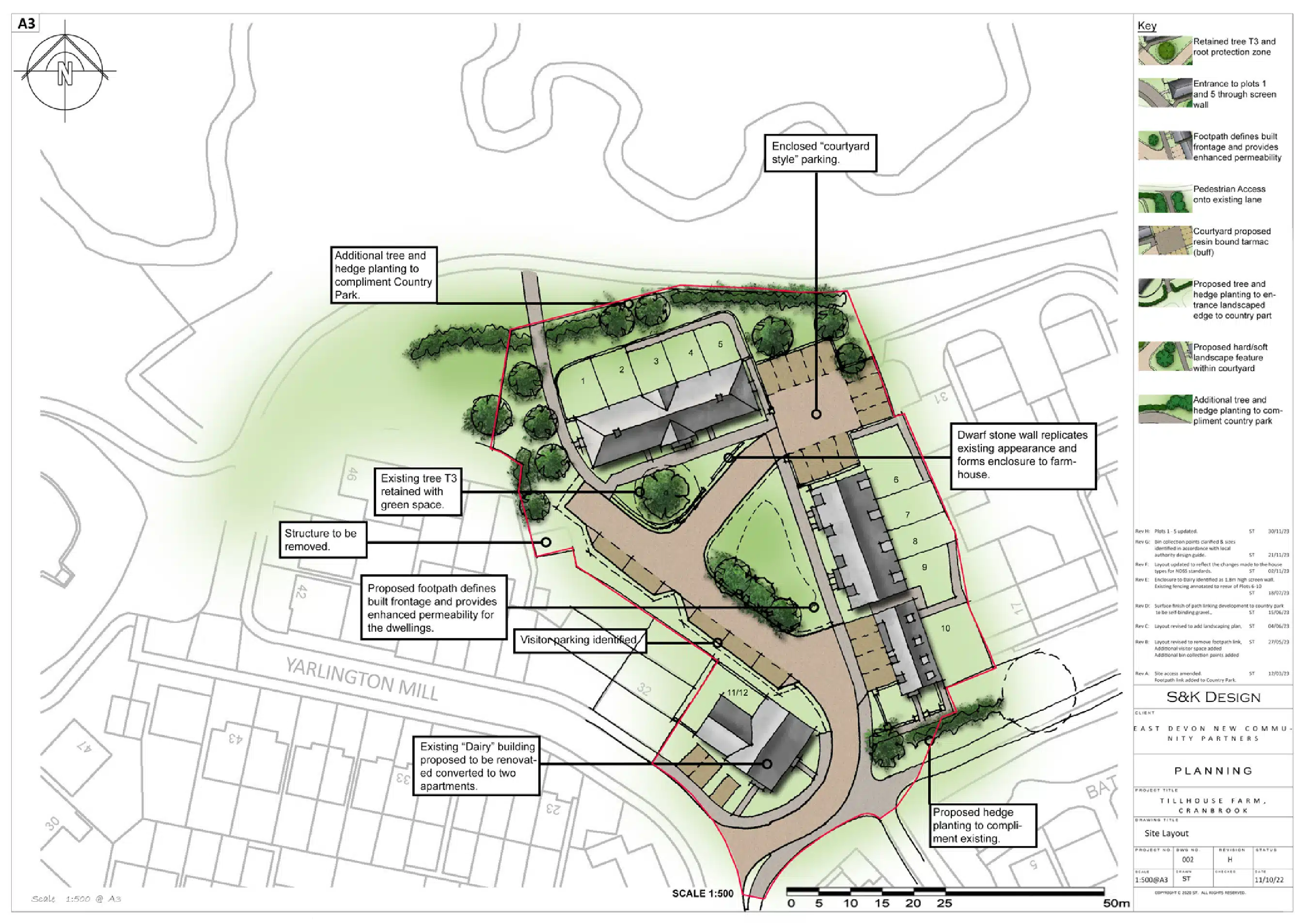 For Sale by INFORMAL TENDER, tenders to be submitted on/before midday 1200, THURSDAY 18 APRIL 2024. The property comprises the former Tillhouse Farm buildings on land extending to approximately 0.45 ha / 1.1 acre, located on the northern fringe of Cranbrook. The site is generally level with recent new residential development abutting the east, south and west boundaries; to the north is the open space of Cranbrook Country Park. The approved development requires the demolition (which the owners will undertake) of the majority of the existing dilapidated farm buildings, retaining only the former dairy building located on the SW corner. The approved layout under 22/2343/MRES shows a terrace of 5 x 3 bedroom two storey houses, a terrace of 4 x 2 bedroom two story houses, a 2 bedroom coach house over garaging and the conversion of the former dairy building into 2 x single storey 2 bedroom dwellings.