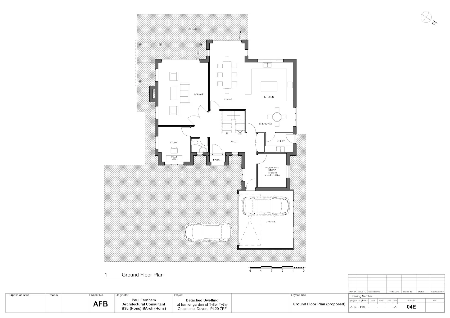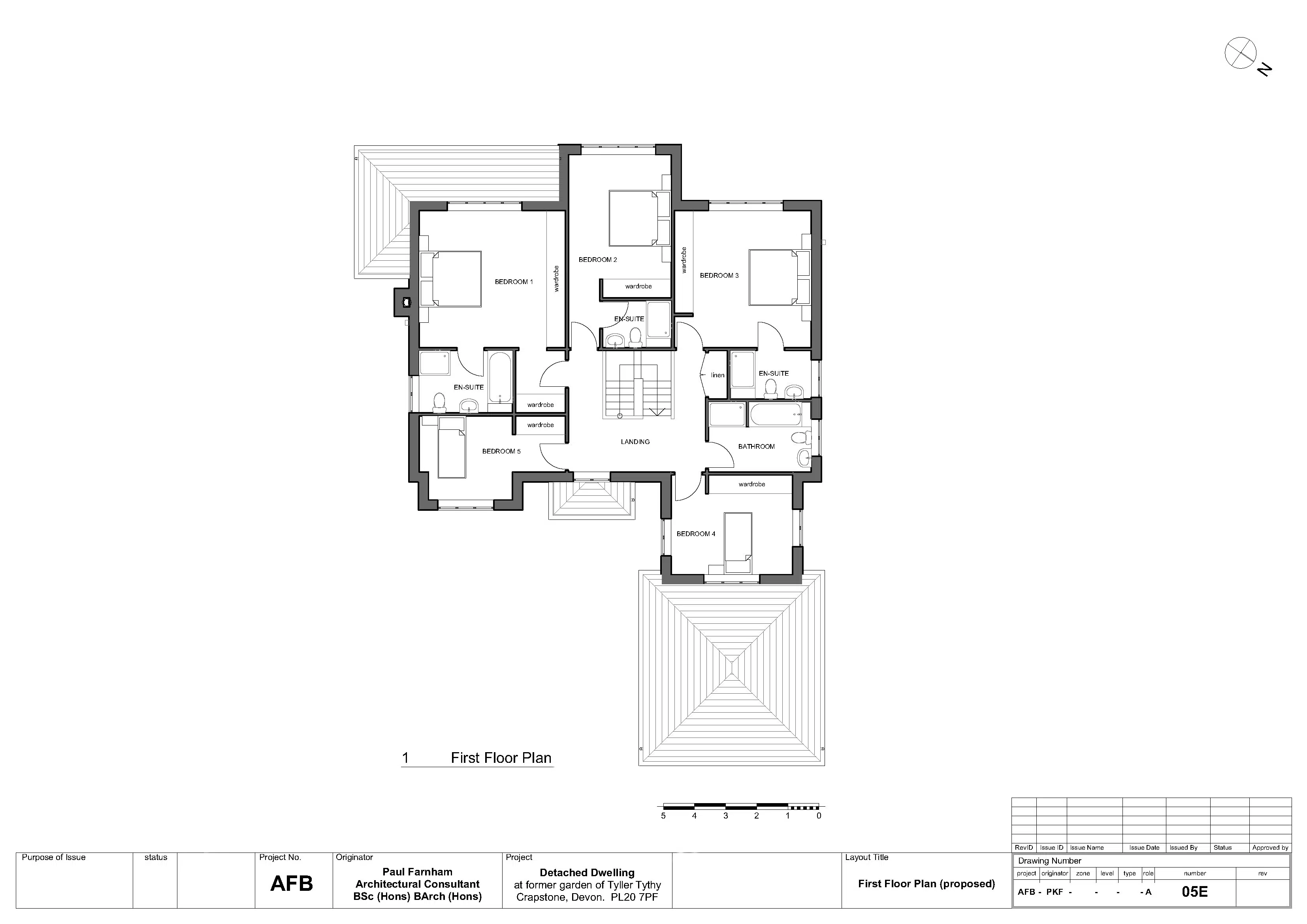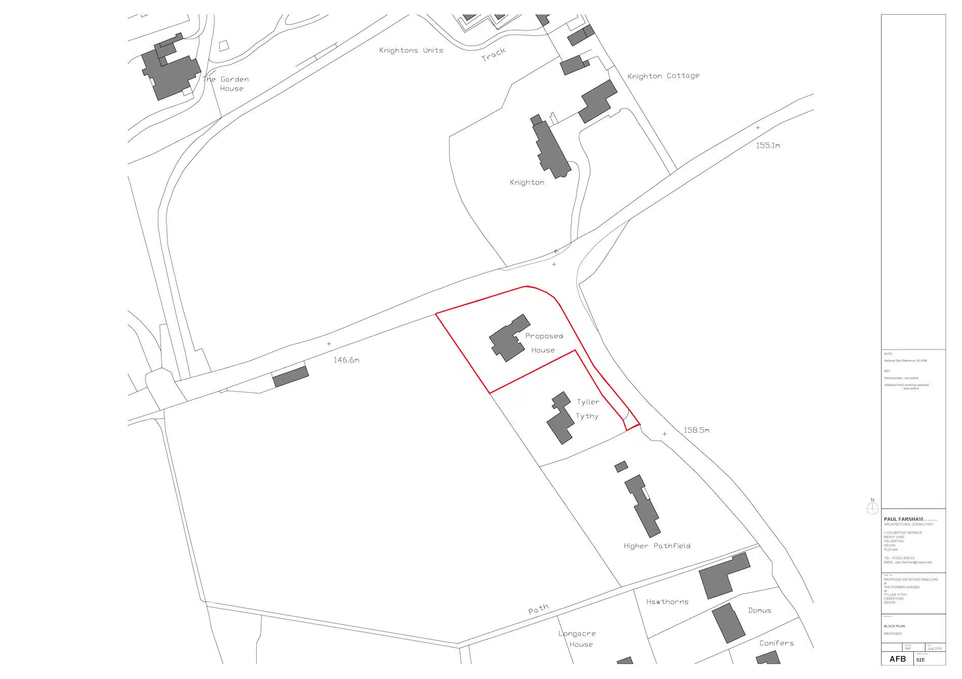 The proposed accommodation comprises lounge, dining room, kitchen, utility workshop and integral double garage on the ground floor. On the first floor there are 5 bedrooms, 3 of which are ensuite and there is a separate bathroom. The dwelling is located fairly centrally within the plot, with gardens on all sides. Access to the site is along an existing track which runs along the eastern edge of the adjoining property (now in separate ownership).