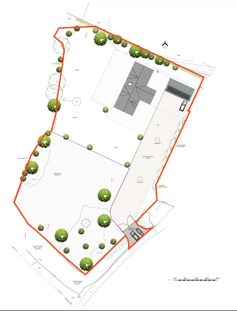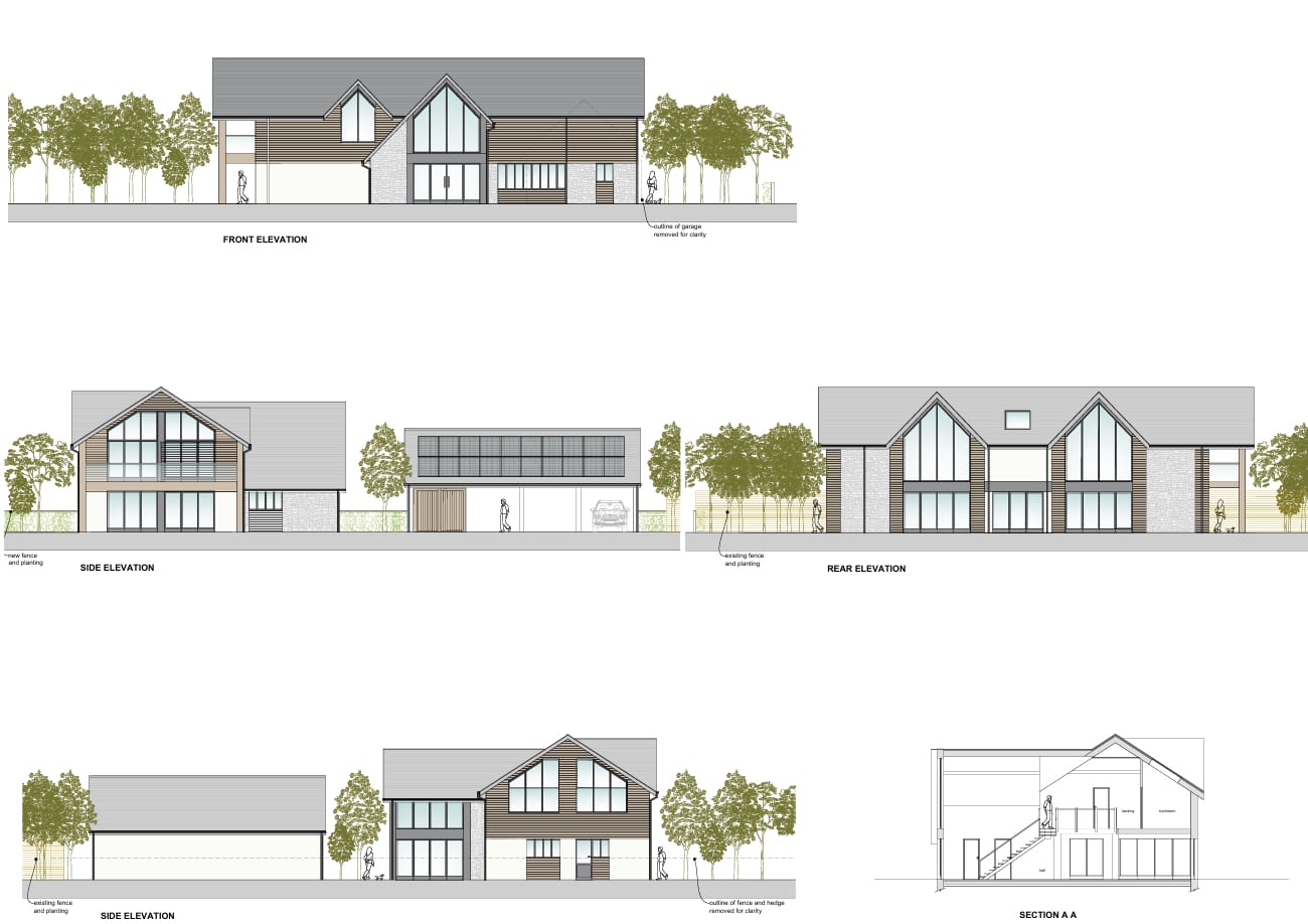 In addition to the new house, a large new detached triple garage is to be constructed with a plant room to the side. There are PV panels proposed on the south facing elevation of the garage roof.