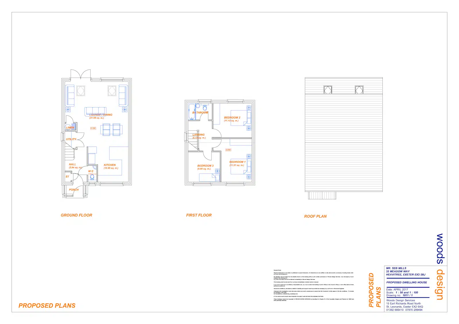 The proposed dwelling is a three bedroom detached house with a gross internal floor area of approximately 97.56m2 (1,050 sqft).
