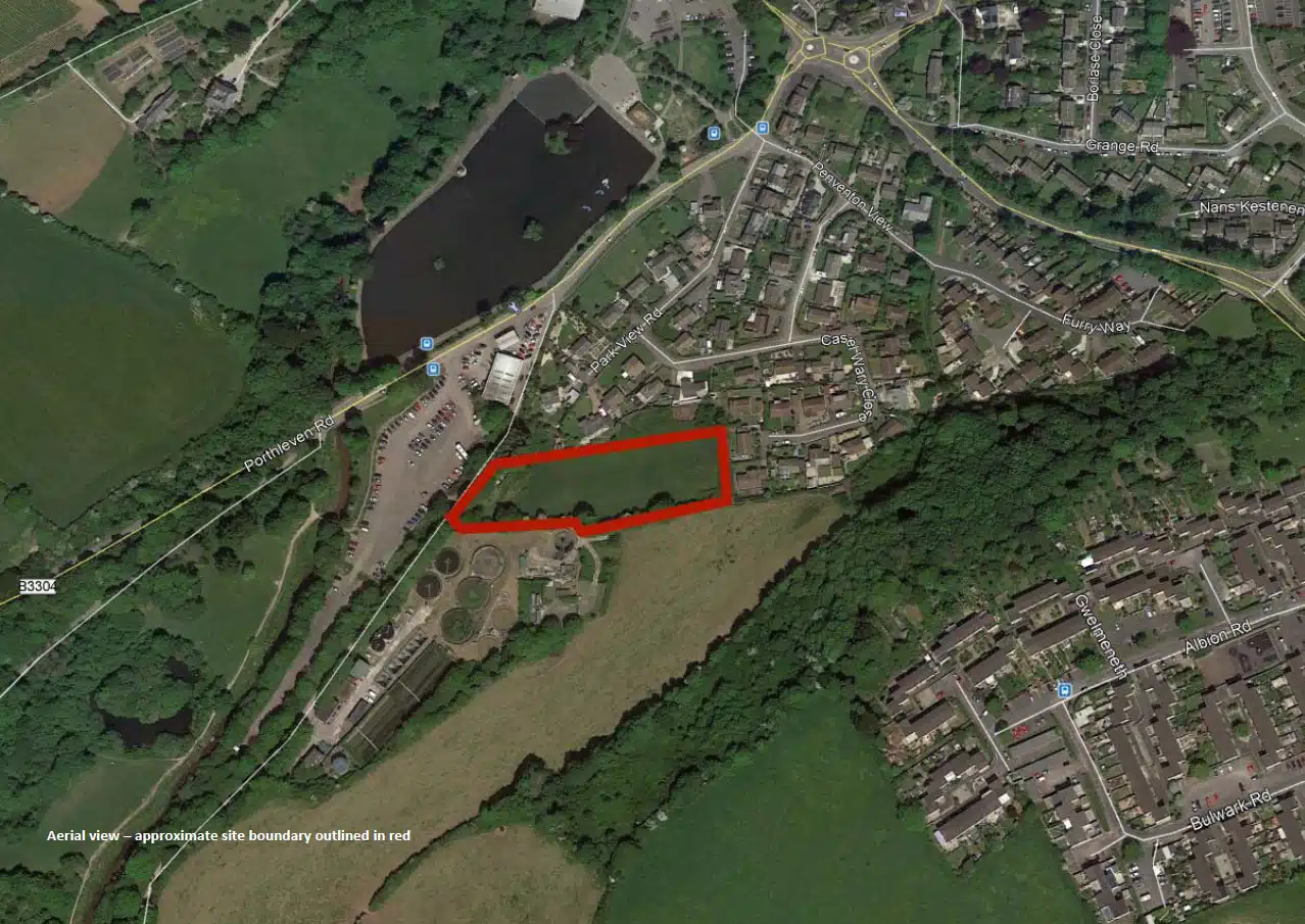 building plot situated in an attractive setting close to the boating lake and Loe Valley car park in Helston. The plot benefits from detailed planning consent for the construction of a new 4 bedroom detached dwelling and garage. The plans approved show the new property taking the form of a spacious bungalow, with accommodation to include an entrance hall, open plan kitchen, living and dining area, utility room and four large bedrooms (master en-suite) and family bathroom. The proposed gross internal floor space extends to c. 171.4sqm (1845sqft). Alongside the new dwelling a large detached double garage is proposed with a floor area of c. 67.8sqm (730sqft). The plot itself extends to approx. 0.21 ha (0.51 acres), although this is offered with additional land under ownership of the vendor taking the site being offered to a total of c. 0.65 ha (1.61 acres).