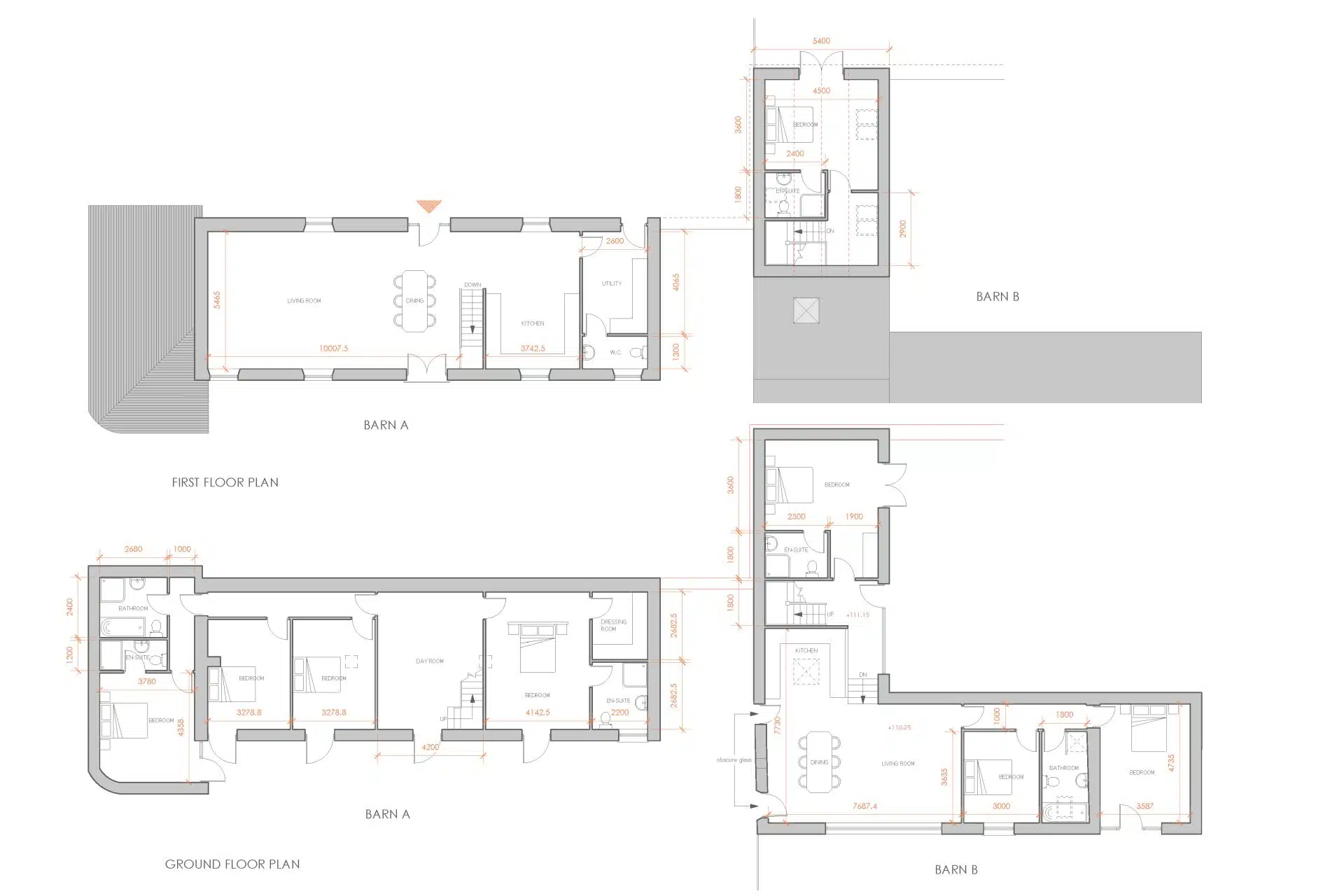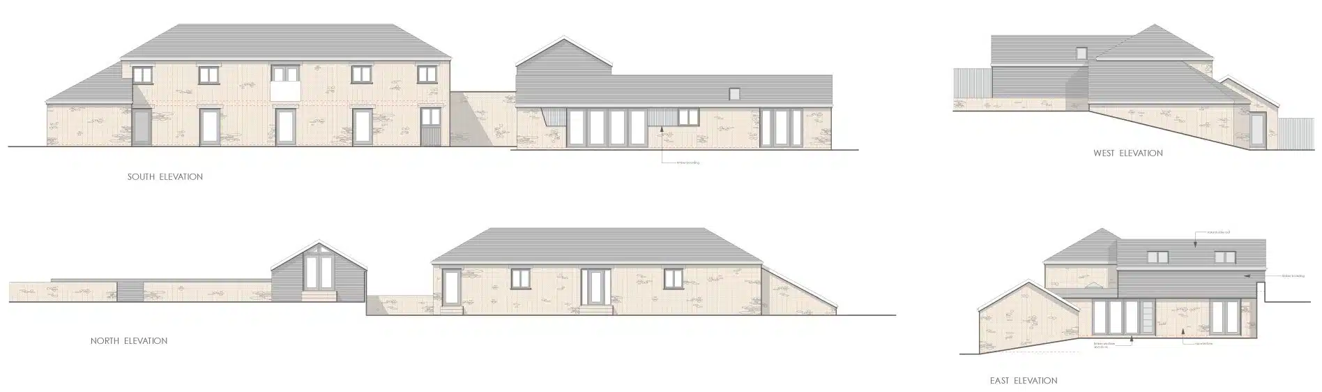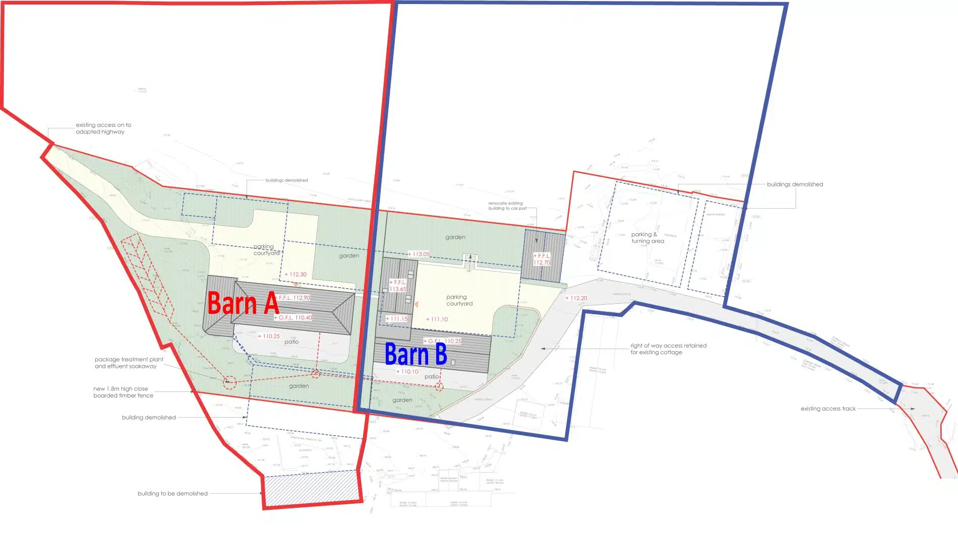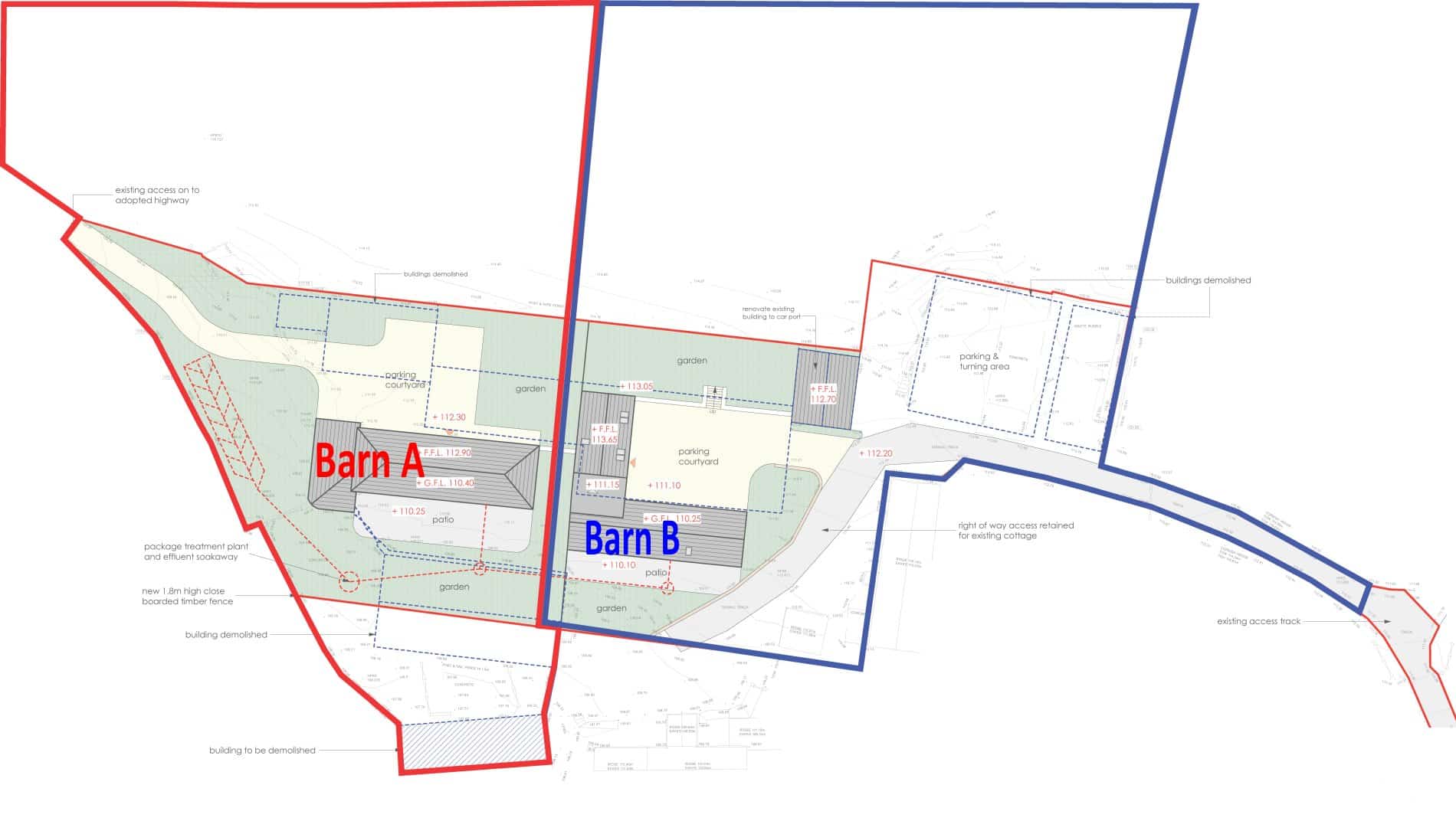 market with the benefit of detailed planning permission to create a spacious 4 bedroom detached dwelling with a gross internal floor area of approximately 223m2 (2,400sqft). The proposed plans show the bedrooms on the ground floor and the living accommodation on the first floor to take advantage of the glorious views to the south towards St Austell Bay, and also to allow for access to the living accommodation from the north of the barn which is at a higher level. This barn will have its own vehicular access to the west from the highway and the plot extends to approximately 0.04 hectares (1.0 acres) and includes the disused barn at the southern end of the plot which is currently shown as being demolished on the proposed plans.