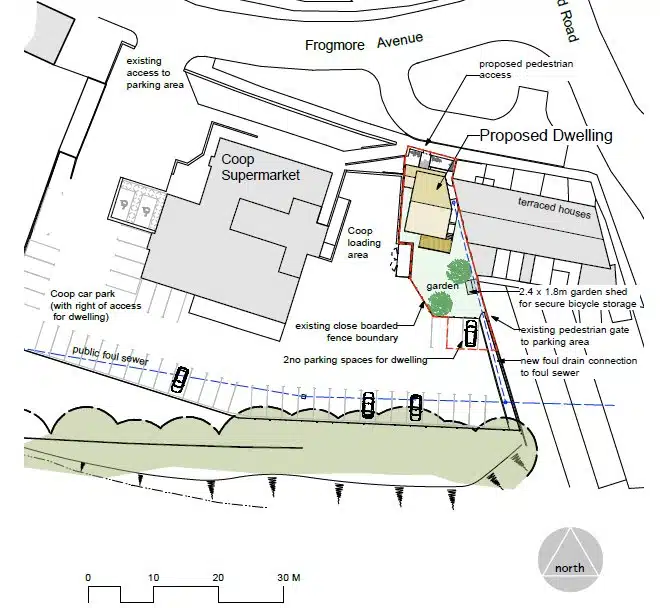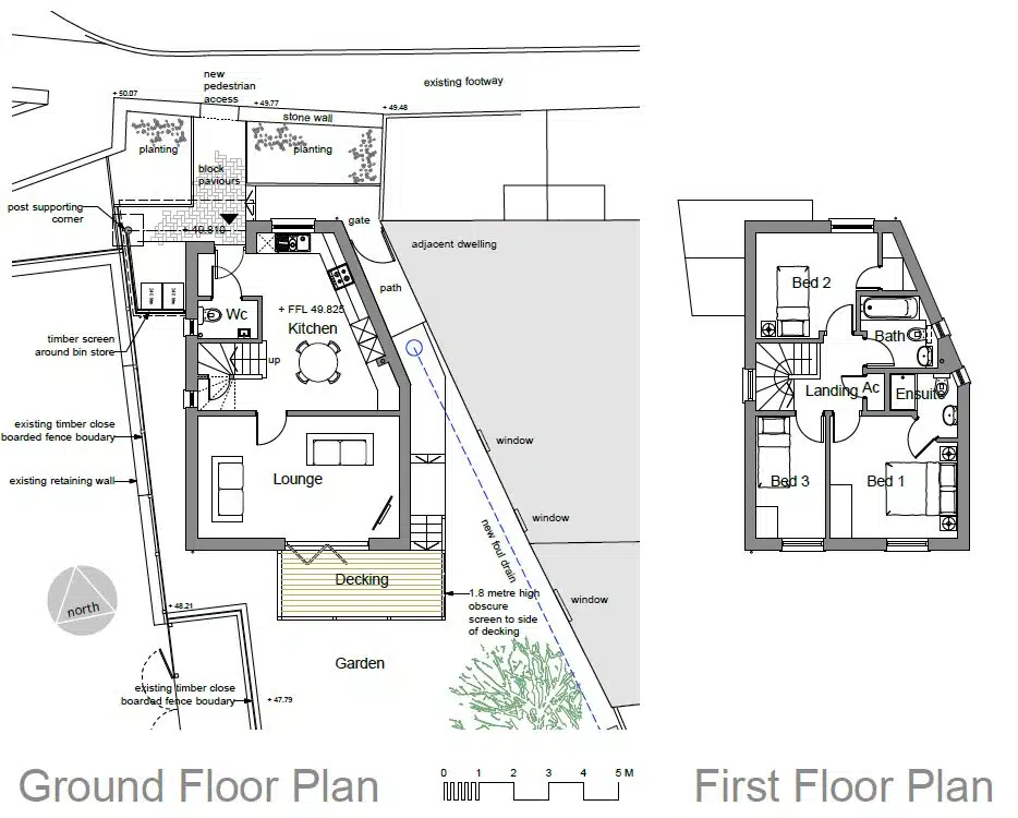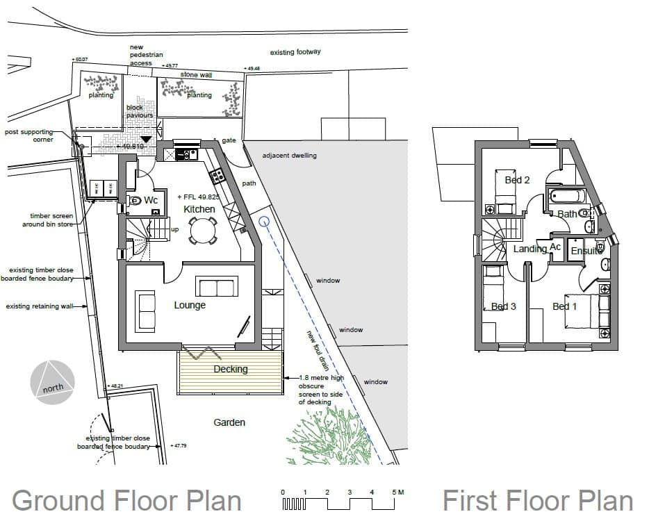 development of a new two storey detached house with a gross internal floor area shown to extend to c. 91.3sqm (983sqft). The new house is proposed with accommodation to include an open plan kitchen dining area, lounge and W.C. on the ground floor, with three bedrooms (master en-suite) and a bathroom on the first floor.