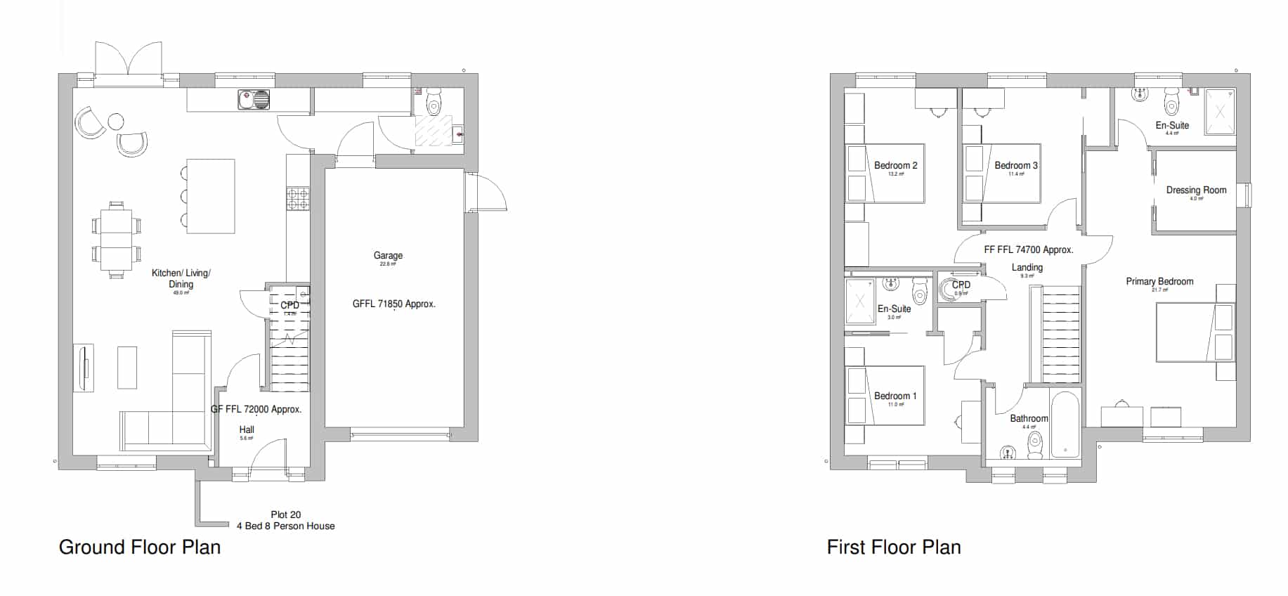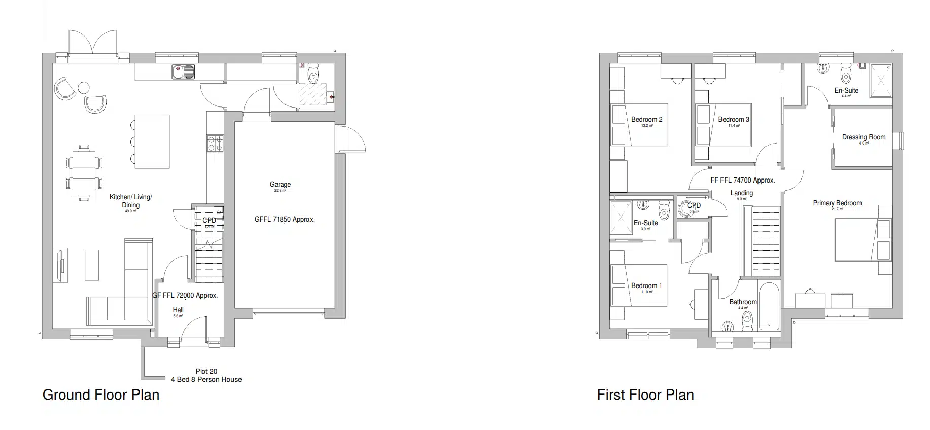 The planning approval for Plot 20 (ref. 20/01926/FUL), shows the proposed new dwelling to be a two storey, detached house with integral garage. On the ground floor, an entrance hall leads to a large open plan kitchen/living/dining area, with separate utility room, W.C. and the garage. On the first floor, four bedrooms are proposed (two with en-suite bathrooms and the master bedroom with a dressing room) along with a family bathroom. To the front of the property, two off road parking spaces are proposed and good sized garden is proposed at the rear. The plot itself extends to c. 0.09 acres.