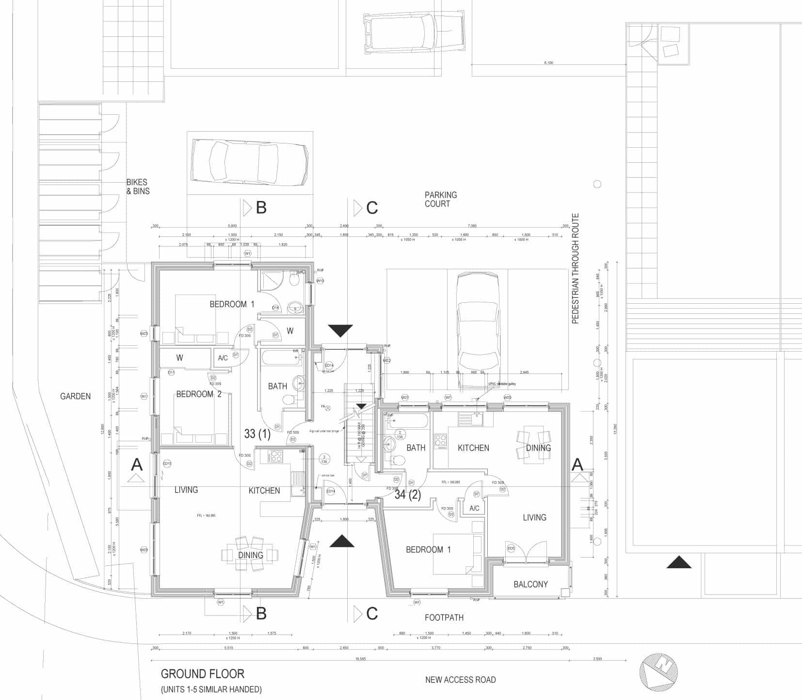 The approved proposed plans are for two, one-bedroom apartments (circa 460 sqft each) and three, two-bedroom apartments (circa 730 sqft each). The plots are labelled as Nos. 33 to 37 on the site layout plan.