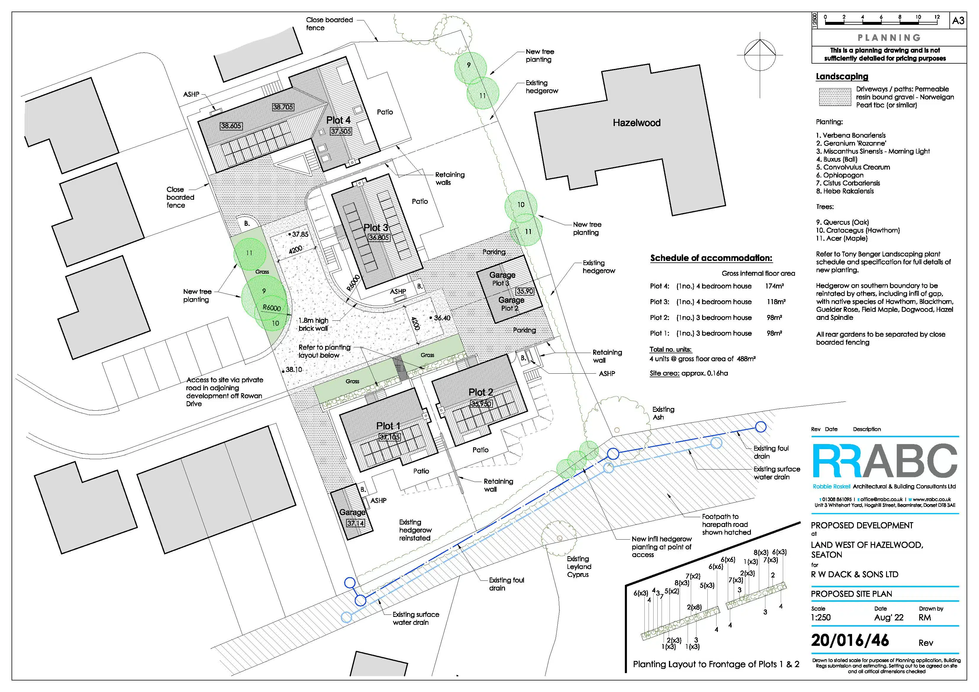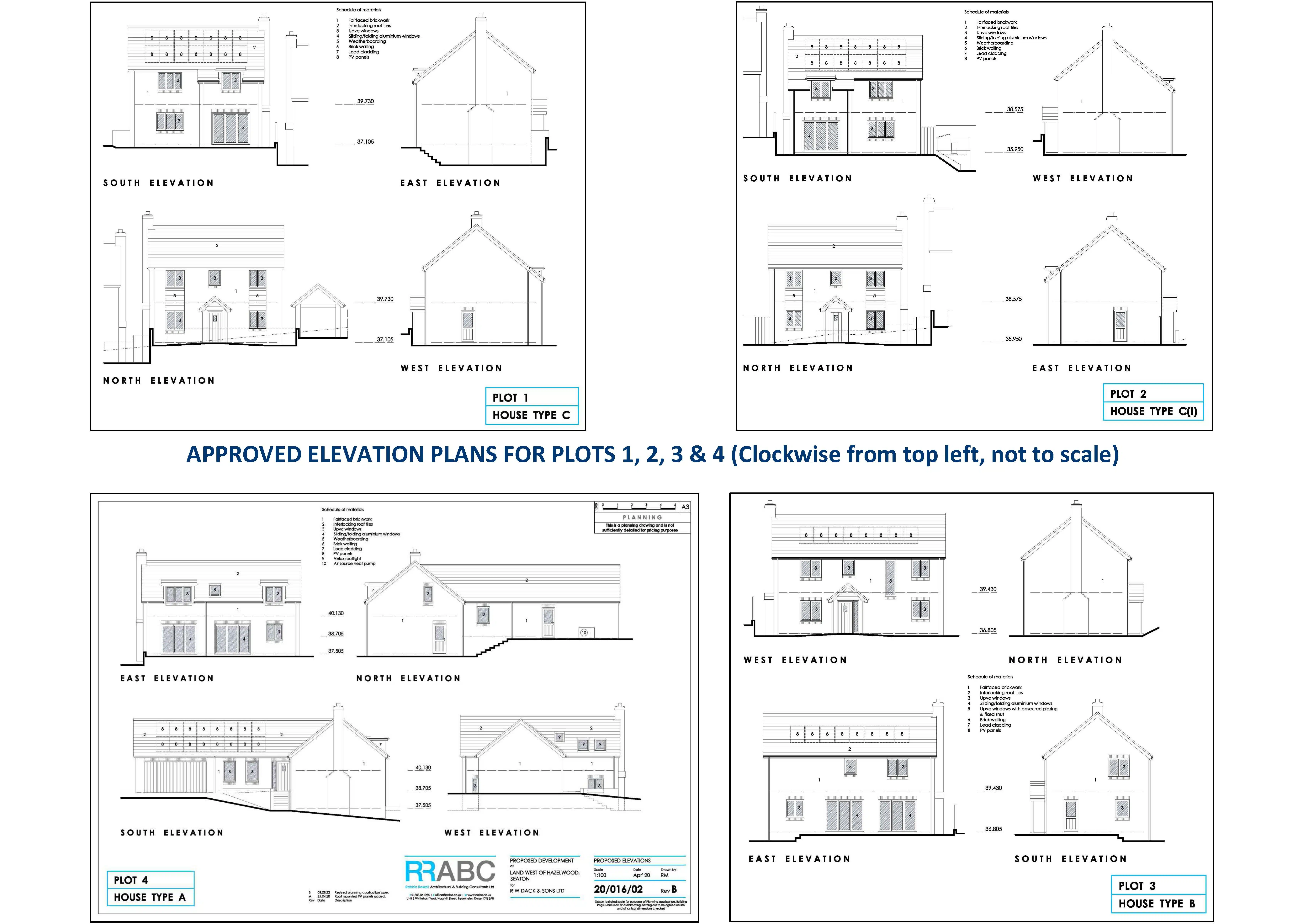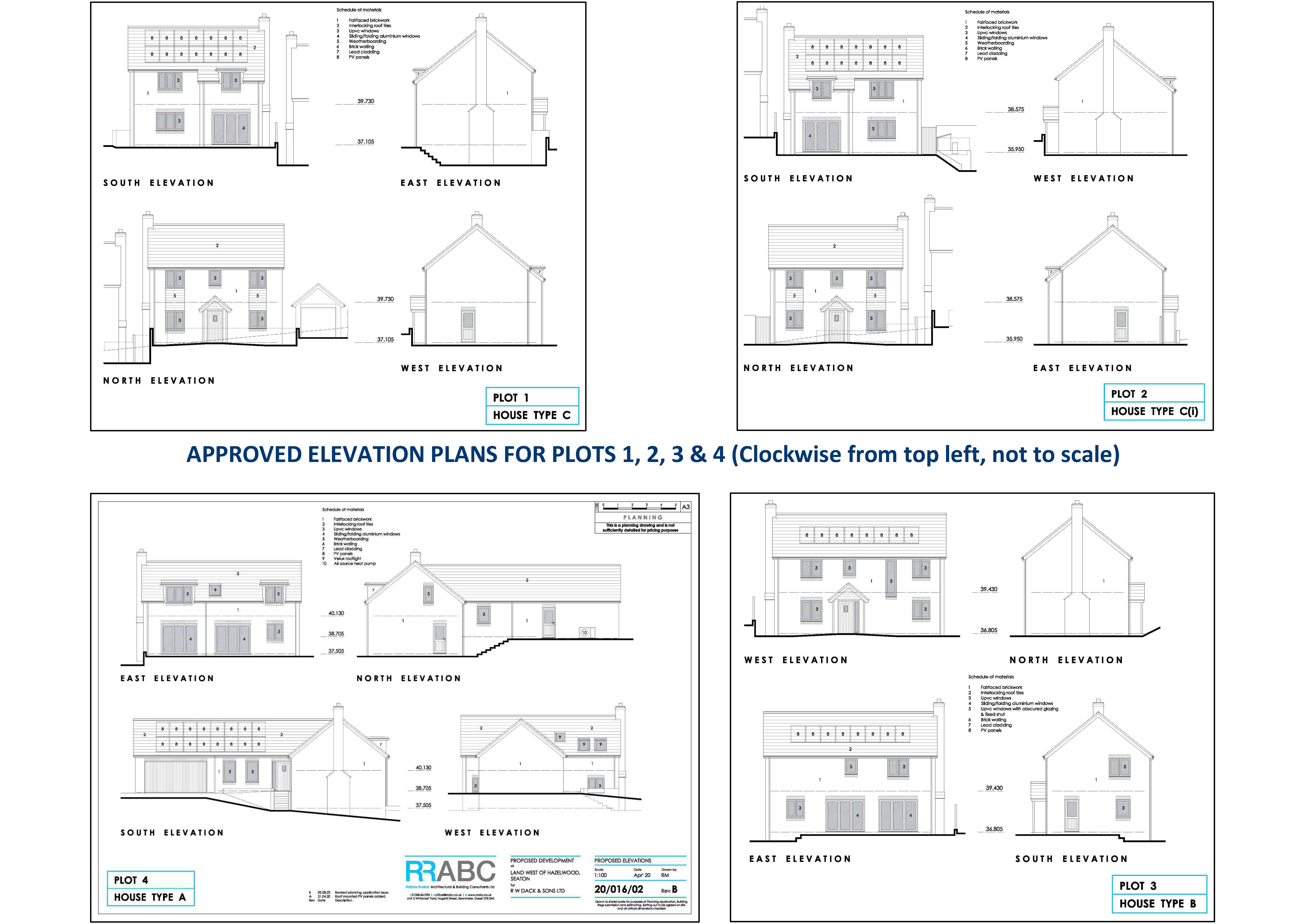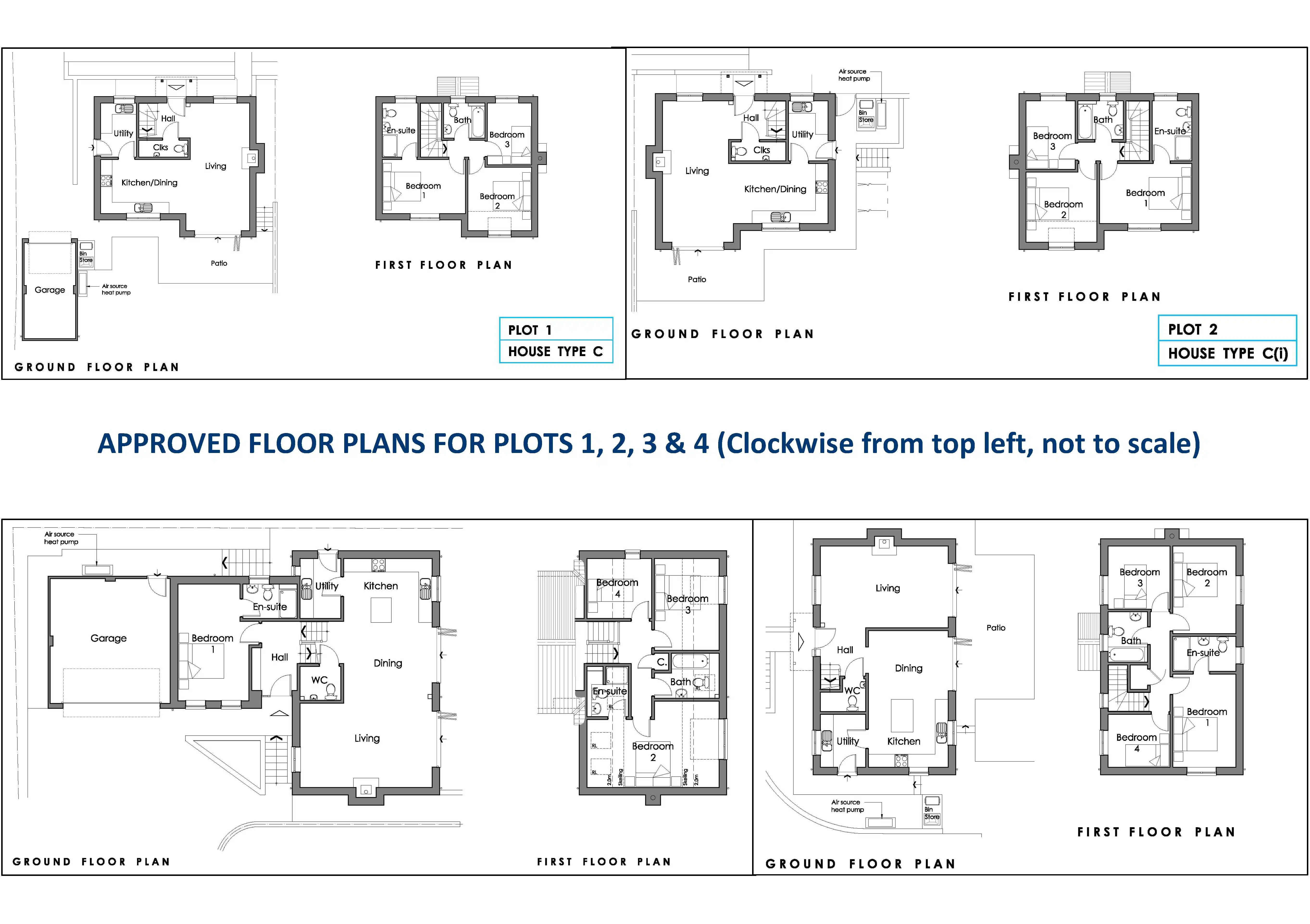The approved plans are for 2 x detached 3-bedroom houses each with gross internal floor areas of approximately 98sqm (1,055sqft), a 4-bedroom detached house (GIA approx. 118sqm / 1,270sqft) and a larger 4-bedroom detached house (GIA approx. 174sqm / 1,873sqft) all with garages.